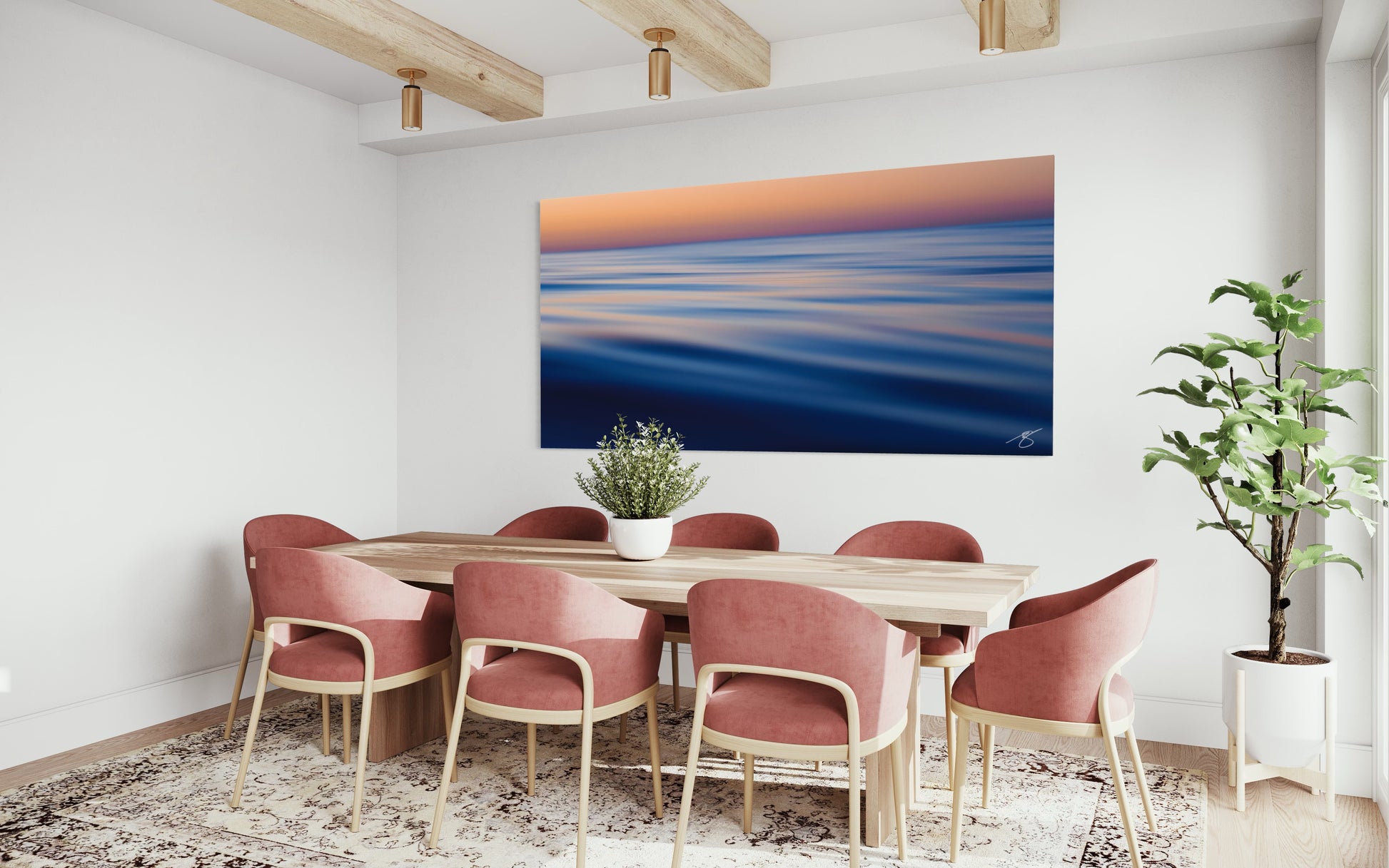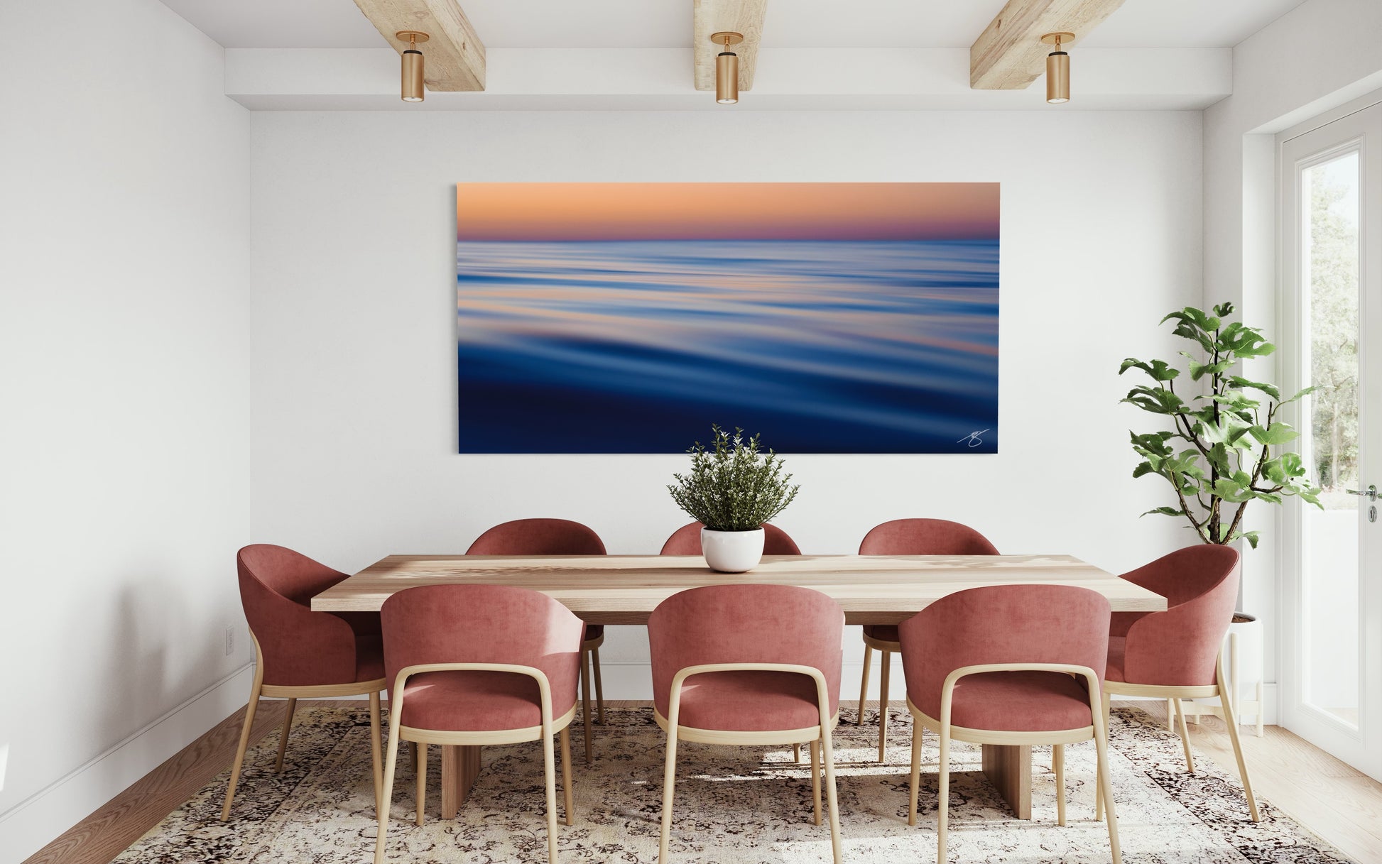 Lose yourself in the hush after sunset. This minimalist seascape turns soft, long-exposure ripples into silky blue ribbons beneath a peach-to-violet sky, creating a soothing focal point for any space. Printed as museum-grade fine art, this calming coastal wall art pairs beautifully with modern, beach, or spa-inspired décor and brings a quiet, meditative energy to bedrooms, living rooms, and offices.