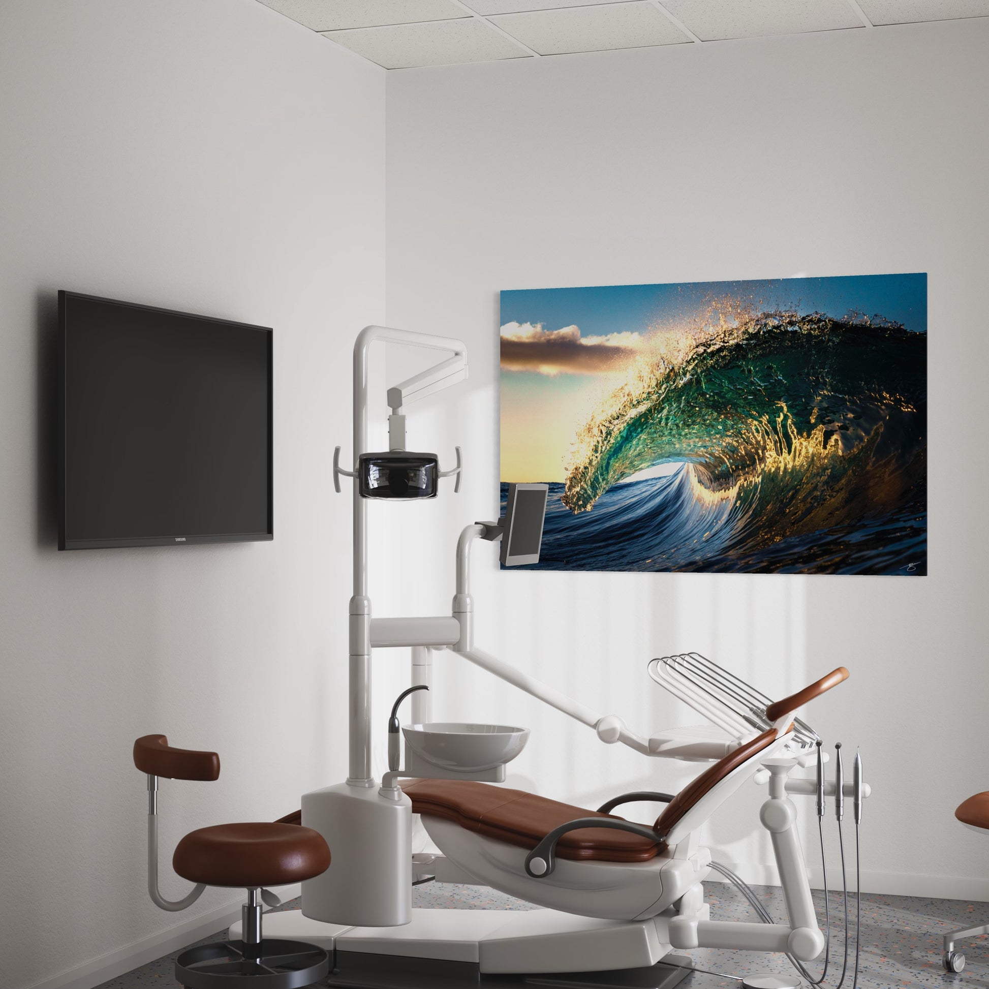 This close-up of a perfectly curling wave catches the first golden light of sunrise, turning teal water into liquid glass. Shot in the impact zone with crisp detail—spray, texture, and a glowing barrel—this piece brings the power and calm of the ocean into your space. Ideal for coastal décor, surf shacks, modern living rooms, and offices.