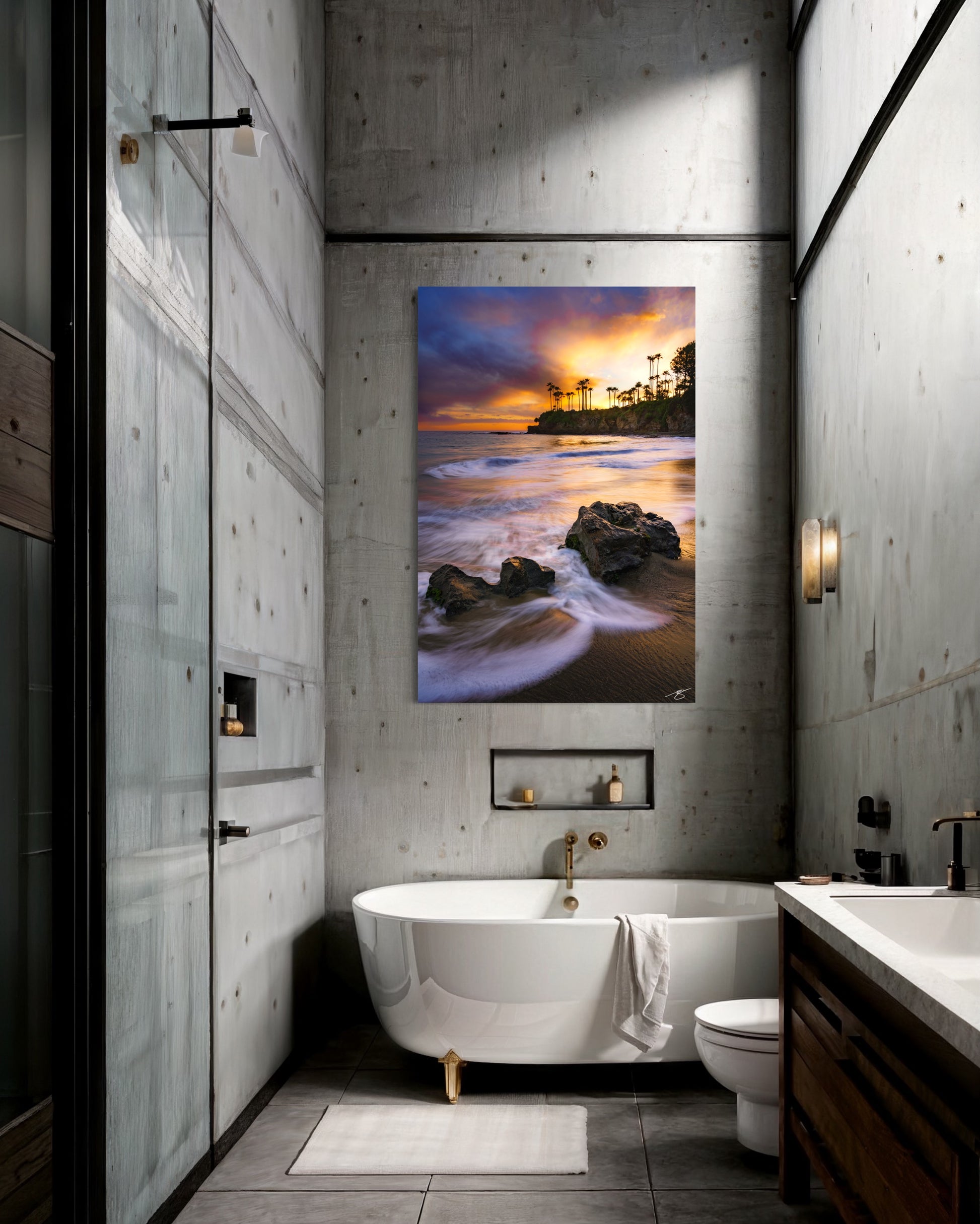 A radiant California sunset glows over Laguna Beach’s Heisler Park as waves curl around tide-washed rocks. Captured by fine art photographer Beau Jesse Johnston, this limited-edition print evokes the serenity and energy of the Pacific coast—an elegant centerpiece for collectors of coastal fine art.