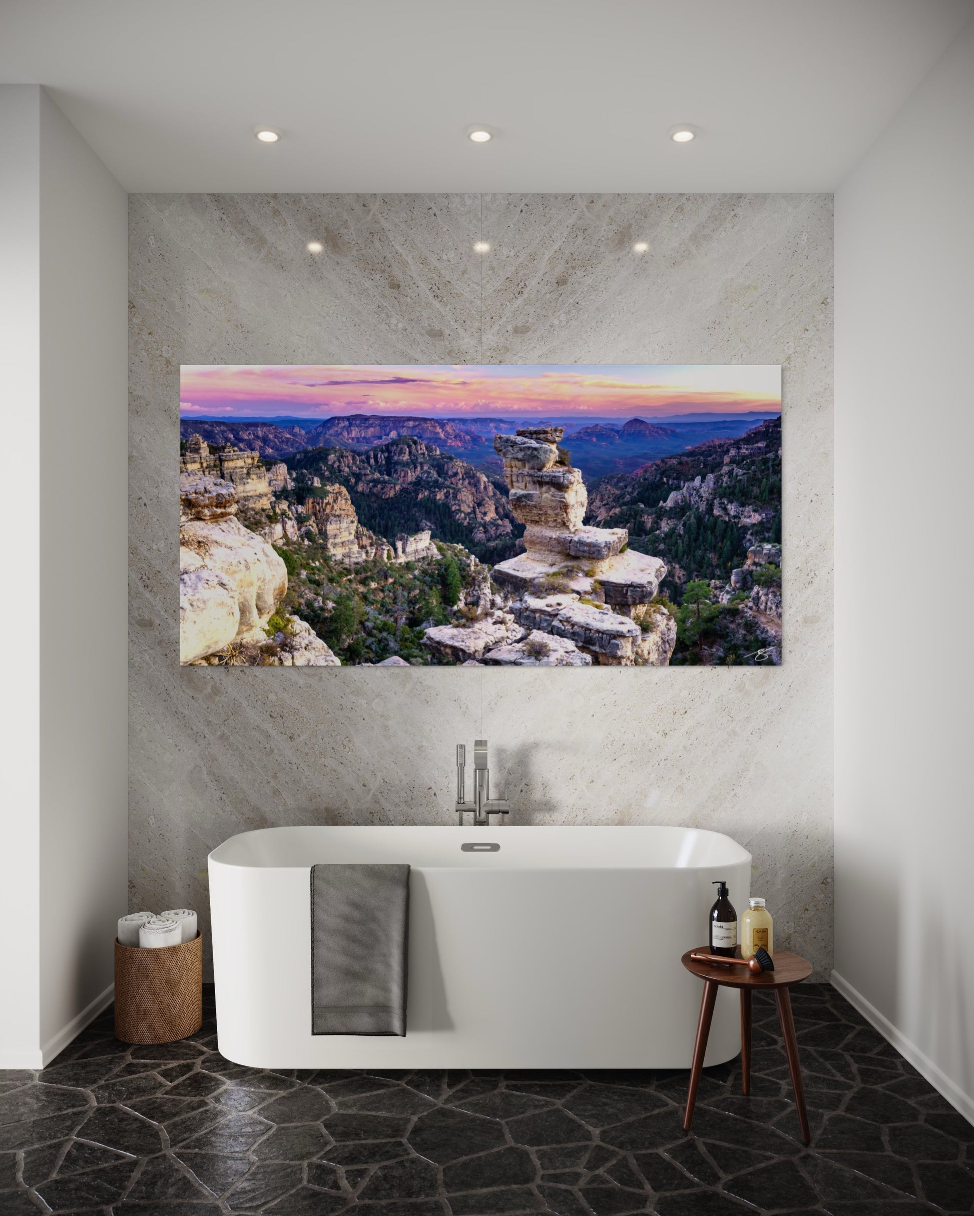 A sculpted hoodoo rises like a stone crown above a vast expanse of pine-lined canyons as pastel sunset paints the sky. This panoramic Arizona landscape brings depth, serenity, and a sense of adventure to any space. The fine detail—weathered limestone, forested valleys, and distant mesas—makes a striking centerpiece for living rooms, entryways, or offices.