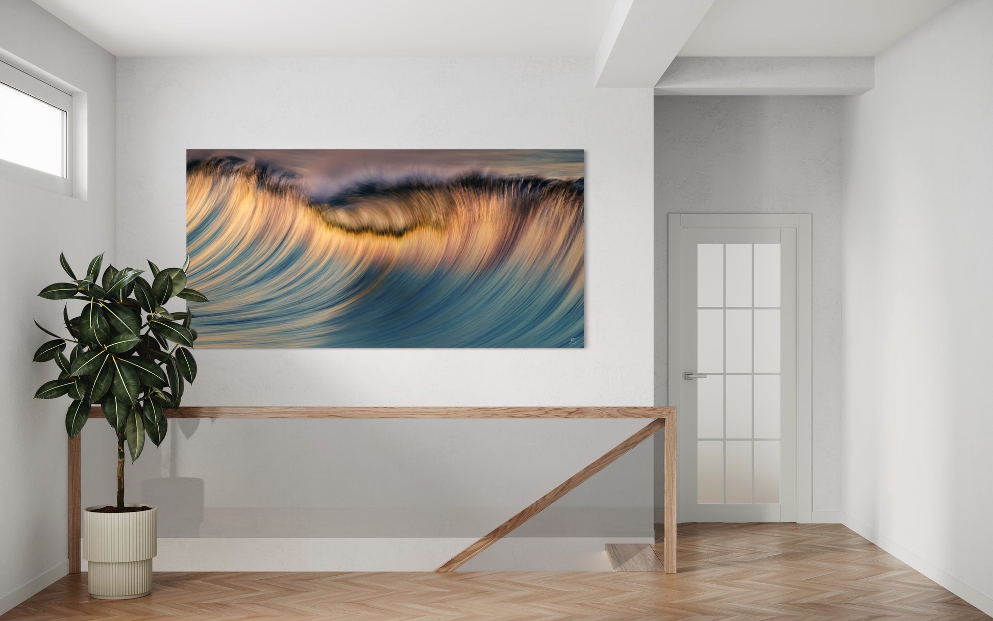 This abstract ocean photograph turns a breaking wave into flowing ribbons of gold and indigo, captured with intentional motion for a smooth, painterly feel. The panoramic format and warm-cool palette create a soothing, modern statement piece that pairs with coastal, contemporary, or minimalist décor.