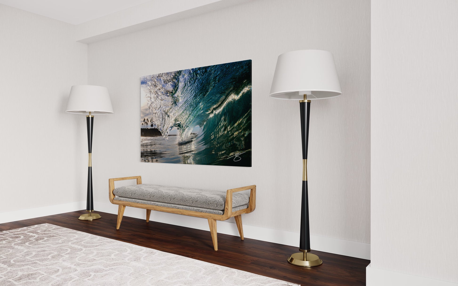 Shot from the waterline, this photograph freezes a glassy wave as it hollows into a perfect barrel, scattering silver light across the surface. Palm trees and a quiet cove frame the scene, adding a timeless coastal vibe. The crisp texture, luminous reflections, and immersive perspective make this a striking centerpiece for modern or beach-inspired interiors.