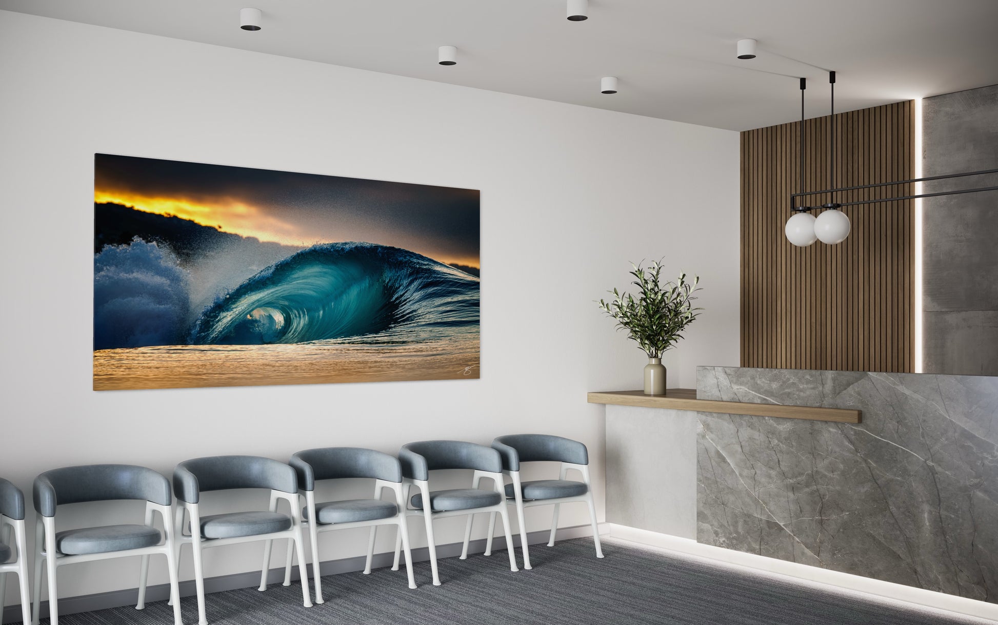 A flawless, glassy barrel catches first light as golden sunrise glows beneath stormy clouds. This high-detail ocean photograph delivers power and calm in one frame—perfect statement art for coastal décor, living rooms, or offices.