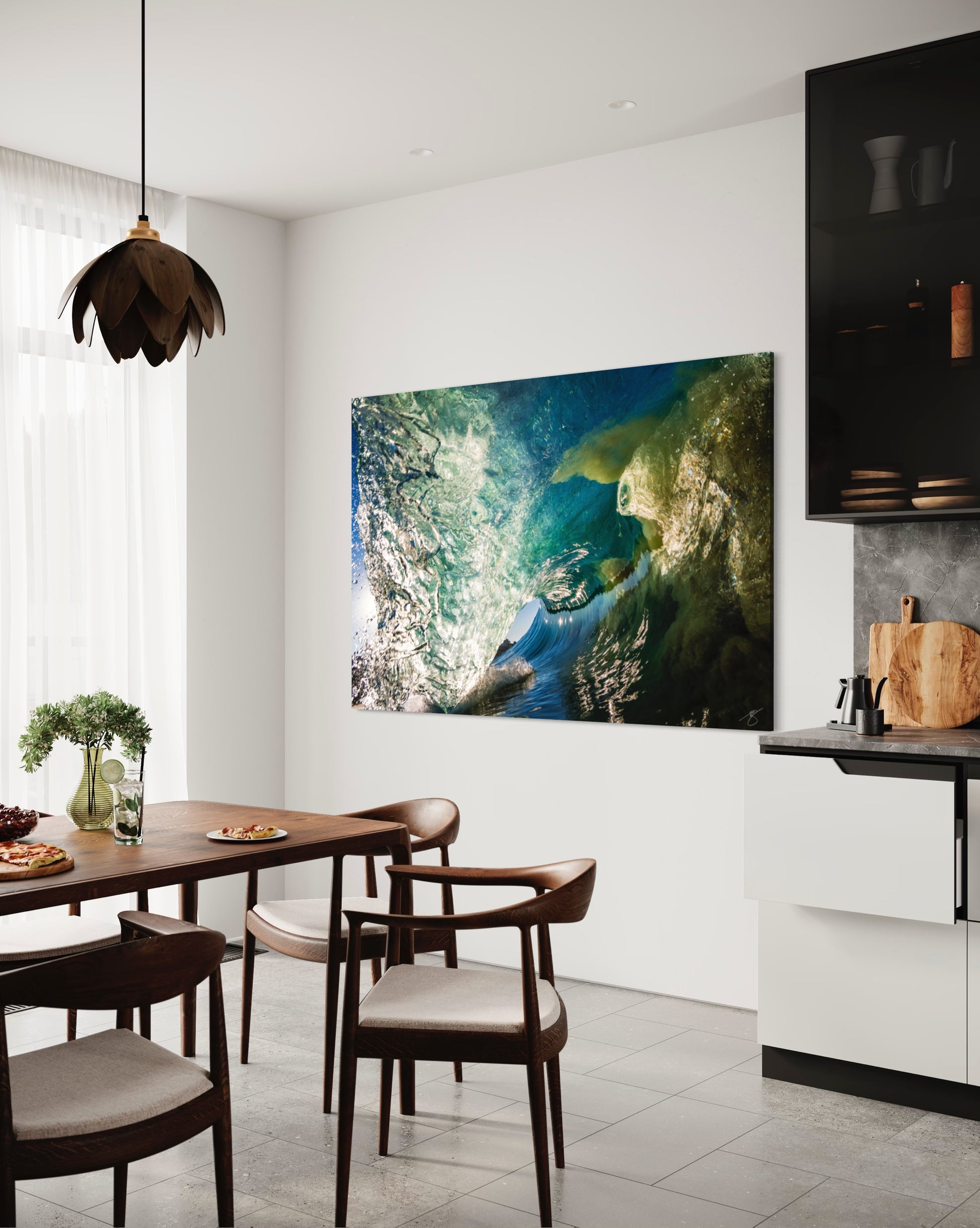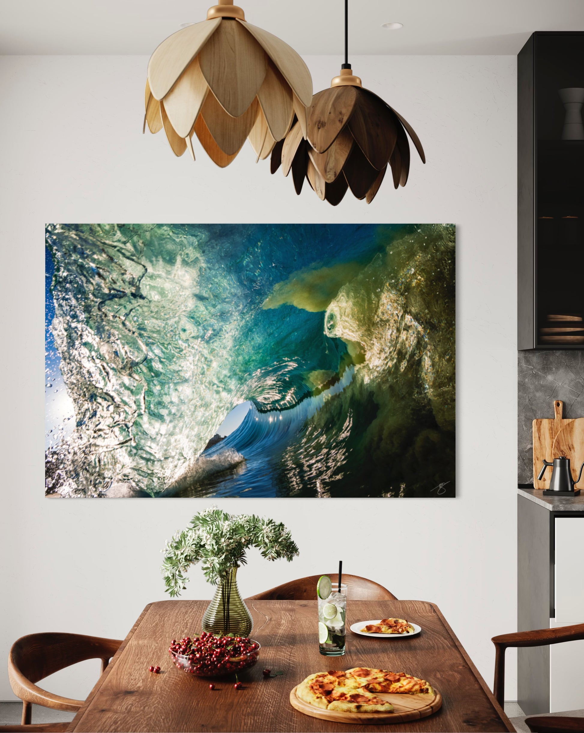 Step inside a crystal-clear turquoise barrel as sunrise light scatters diamonds across the face of the wave. Shot from the impact zone, this dramatic ocean photograph captures swirling sand, shimmering textures, and the perfect curl just before it closes out. “Emerald Barrel” brings coastal energy and movement to modern homes, beach houses, and surf-inspired spaces.