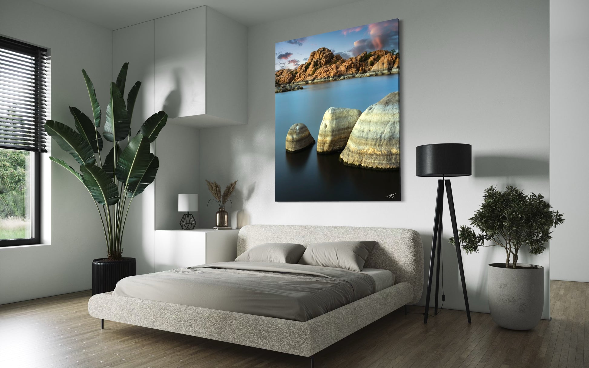 Stillness in Stone by Beau Jesse Johnston captures the quiet elegance of Watson Lake in Prescott, Arizona. Smooth granite domes rise from mirrorlike water beneath pastel skies — a serene contrast of texture and reflection. This fine art desert landscape evokes peace and permanence, making it a collector’s centerpiece for lovers of the American Southwest.