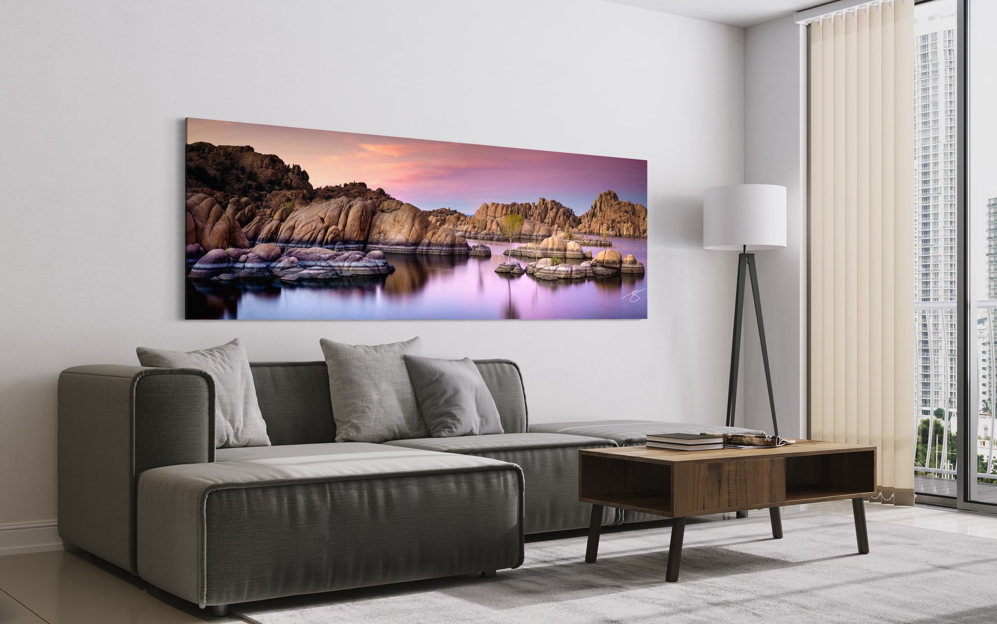 A pastel Arizona sunset washes the Granite Dells of Watson Lake in rose and lavender as smooth, glassy water reflects rounded boulders and tiny tree-topped islets. This long-exposure panorama blends sculptural rock forms with calm color—an elegant focal point for modern, rustic, or Southwestern interiors.