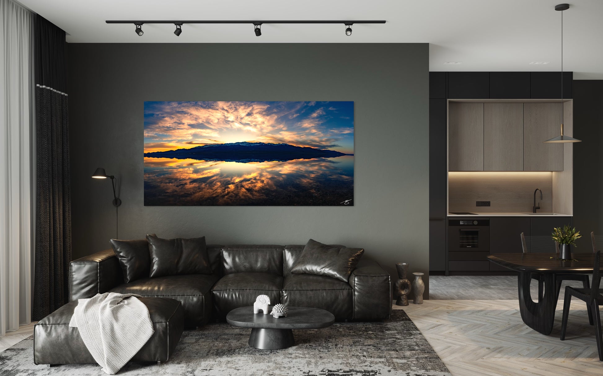 A glass-calm lake transforms into a perfect mirror as warm sunset light crowns a snow-tipped mountain range and paints the sky in gold and cobalt. This ultra-wide panorama brings serene symmetry and drama to any room—ideal above a sofa, bed, or long hallway.